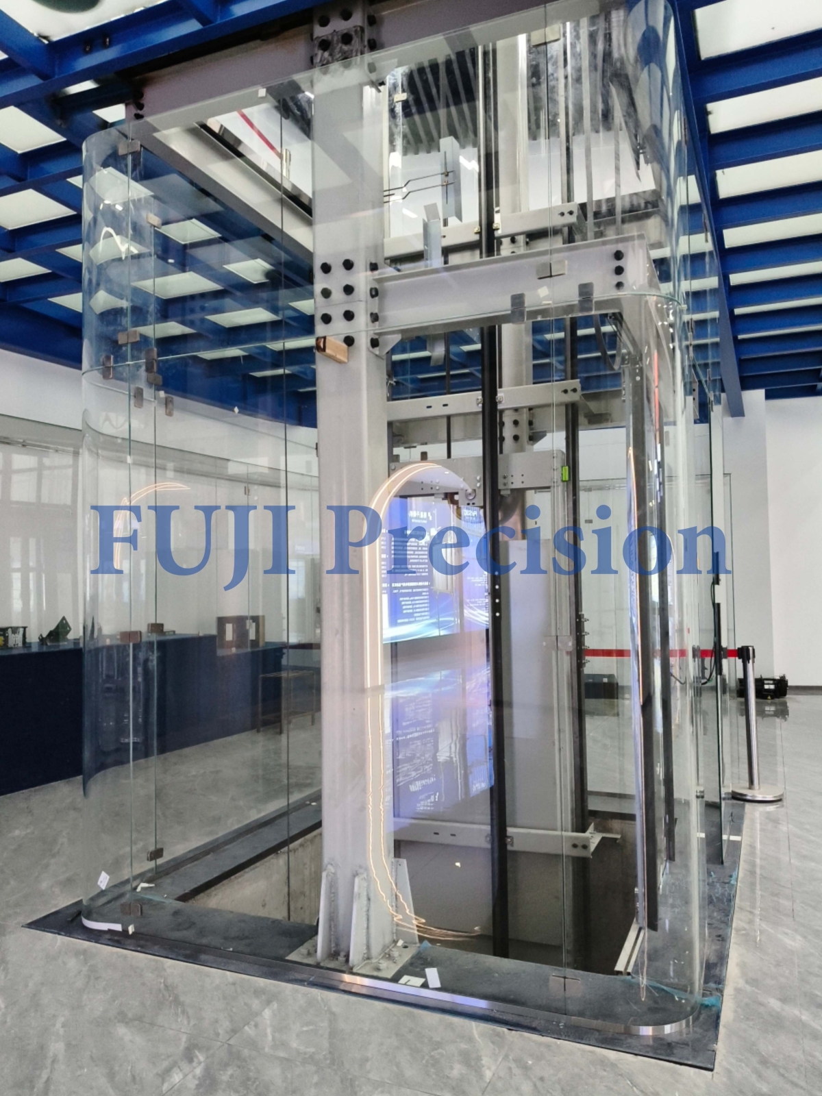 Компания FUJI Precision представляет премиальное решение для выставочных залов — панорамный лифт с изогнутым стеклянным углом, разработанный для улучшения архитектурной эстетики и восприятия пространства.